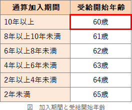 - [不適切]。通算加入者等期間別の受給開始可能年齢は以下のようになっています(DC法33条)。56歳0カ月から加入者になった場合、60歳時点における通算加入者等期間は「60歳-56歳=4年」なので、「4年以上6年未満」の区分に該当し、63歳から請求が可能になります。