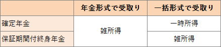 - 定額個人年金保険(保証期間付終身年金)において、年金受取人が年金支払開始日後に保証期間分の年金額を一括して受け取った場合、当該一時金は雑所得として所得税の課税対象となる。