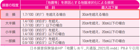- 適切。地震等を原因とする地盤液状化による損害の認定基準は、建物の区分と、地盤液状化による建物の「傾斜」または「最大沈下量」によって決まります。木造建物(在来軸組工法)の場合、最大沈下量が30㎝を超えるもしくは傾斜が100分の1.7(約1度)を超えるとき、全損と認定されます。
