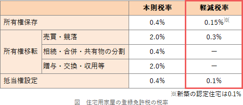 住宅の所有権保存登記に係る登録免許税は本則0.4%ですが、2027年(令和9年)3月31日までの間は、新築住宅を1年以内に登記をすれば税率が0.15%に軽減されます(措置法72条の2)。
