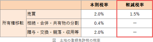 土地の売買による所有権の移転登記等に係る登録免許税は本則2.0%ですが、2026(令和8年)3月31日までの間は1.5%に軽減されます(措置法72条)。