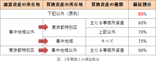 - 不適切。3号買換えでは、集中地域であるなしにかかわらず、譲渡資産・買換資産がいずれも国内にあるものであれば適用を受けられます。ただし、集中地域内外によって課税繰延割合が次のように変わります(措置法37条1項)。